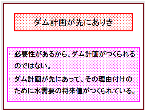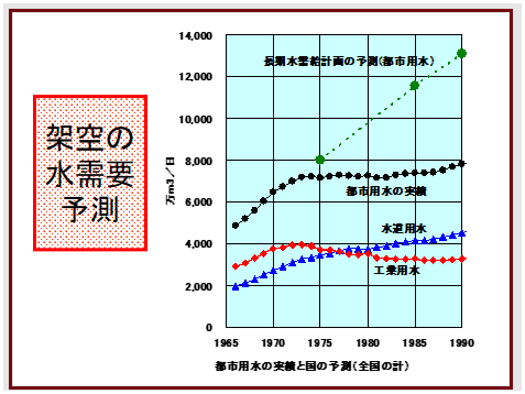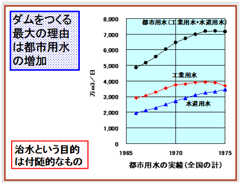 近年、国土交通省は本来のダム建設の目的であった「都市用水の開発」(利水)を脇に置き、防災(治水)を前面に出しています。ここでは治水の問題には触れませんが、これも利水と同様、科学的な検証に堪えるものではありません。
