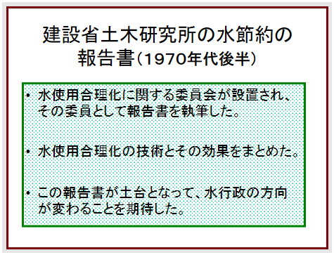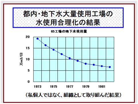 山村を水没させるという究極の地域破壊をどうしたら止められるかー。1970年代に東京都公害局に就職した嶋津さんは、大学院時代のテーマであった節水技術を各工場に普及させることで、都の工業用水を1/3に減少させることに貢献しました。しかしダム計画は止まりませんでした。