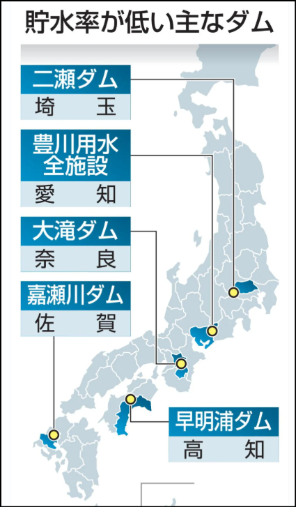 以下のニュースでは、貯水率が低い代表的なダムとして、関東地方・荒川水系の二瀬(ふたせ)ダム(貯水率2%)の名が挙がっています。