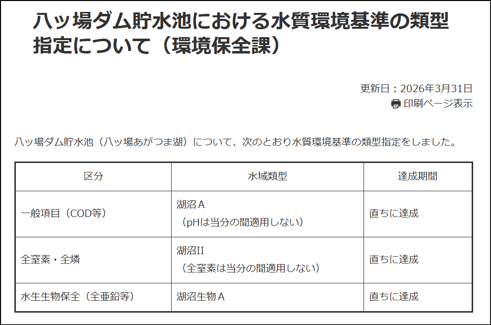 水質調査の際に重要な指標となるのが類型指定です。群馬県は今年の三月末、八ッ場ダム貯水池の類型指定を「河川」から「湖沼」に変更したことをホームページで公表しました。